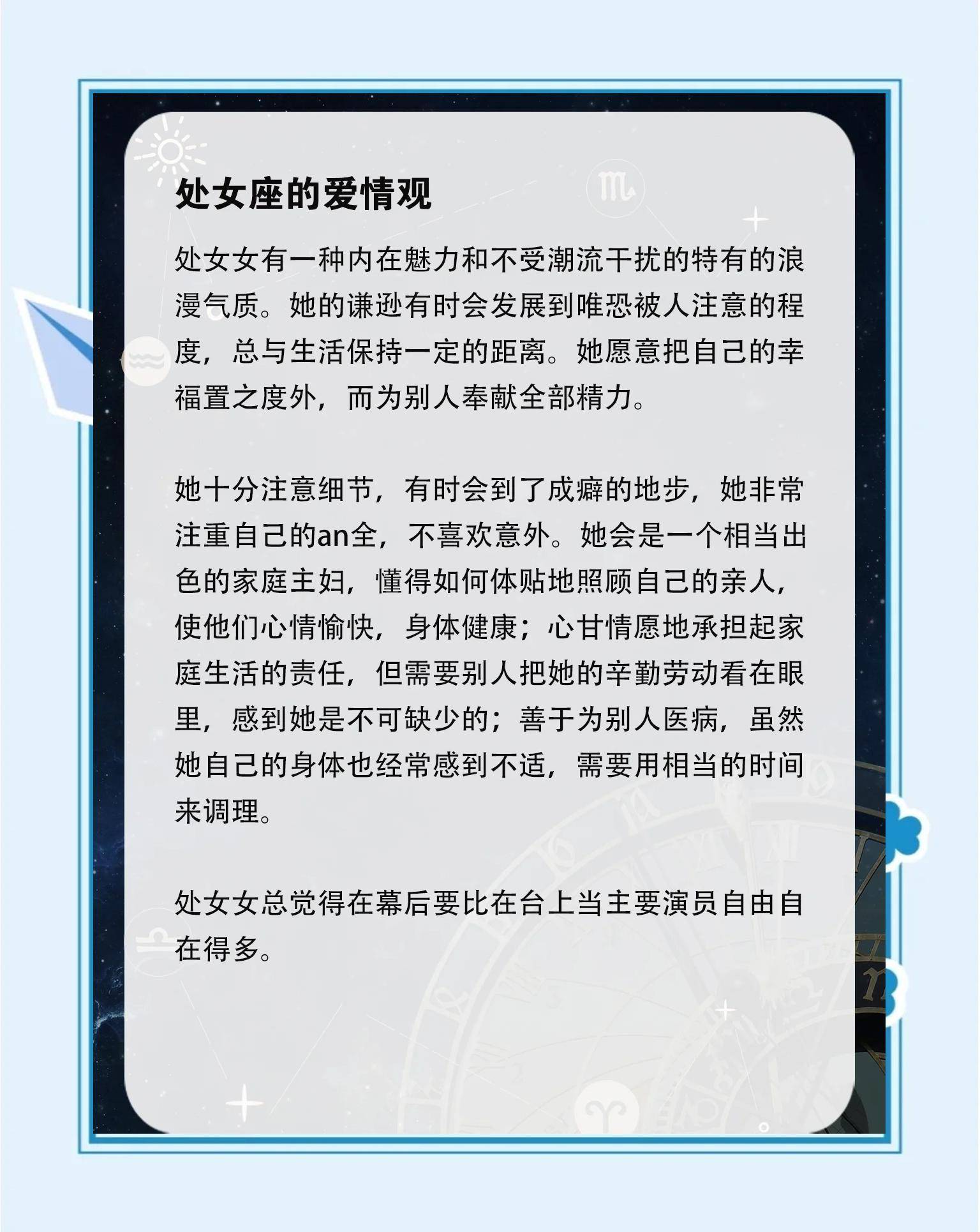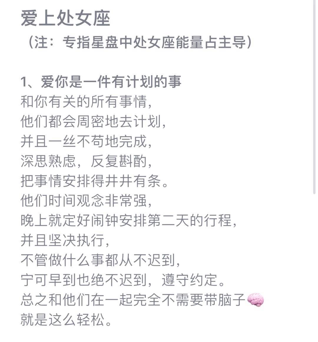 结婚五年的闺蜜最近总在朋友圈晒老公视角的照片:带露珠的栀子花插在她最爱的青瓷瓶里,加班回家时玄关永远留着一盏暖光小灯,连她随口提过的「想试试街角新开的抹茶卷」都会出现在周末早餐桌上。问她婚姻保鲜的秘诀,她眨眨眼:「因为我老公娶了个处女座啊。」这话听着像凡尔赛,却道破了处女座女生在感情里最动人的特质——那些被旁人忽略的细枝末节,恰恰是她们经营婚姻的魔法钥匙。处女座女生的「细节控」从来不是吹毛求疵,而是把爱意拆解成具体的行动坐标。就像星座分析里说的,她们「追求完美却不苛求对方」,会默默记下伴侣的咖啡要加两勺糖、开车时喜欢听的电台频率,甚至连他皱眉时习惯性捏鼻梁的小动作都刻在心里。朋友分享过一个细节:她老公随口说办公室空调太干,第二天抽屉里就多了台迷你加湿器,标签上还用便签写着「水箱记得每周清洗哦」。这种不动声色的体贴,比任何情话都让人安心——原来有人把你的需求,当成自己的KPI来完成。 但处女座的婚姻智慧,更在于懂得用细节化解平淡。她们天生的「秩序感」让生活永远有新鲜感:结婚纪念日未必需要烛光晚餐,但会翻出当年的聊天记录做成手账;周末大扫除时,会故意把他的臭袜子藏在枕头下,然后笑着看他手忙脚乱的样子。就像星盘里说的,这个土象星座「用务实守护浪漫」,她们把婚姻过成了一场需要用心经营的「长期主义」——不是追求瞬间的惊艳,而是让每个平凡日子都闪着细碎的光。难怪有人说,娶个处女座老婆就像拥有了私人定制的幸福方案,那些被记住的小愿望,最终都长成了婚姻里最坚韧的根系。 当然,处女座的细腻也需要被看见。她们习惯把情绪藏在「一切都好」的表象下,就像星座分析提到的「泰然自若的外表下藏着敏感的心」。所以当她为你熨烫衬衫时,不妨从背后给她一个拥抱;当她念叨你忘记关灯时,记得说句「有你在真省心」。婚姻里最好的保鲜剂,从来都是双向奔赴的细节——你懂她的挑剔是因为在乎,她知你的包容是因为珍惜。毕竟对处女女来说,最浪漫的三个字不是「我爱你」,而是「我记得」。